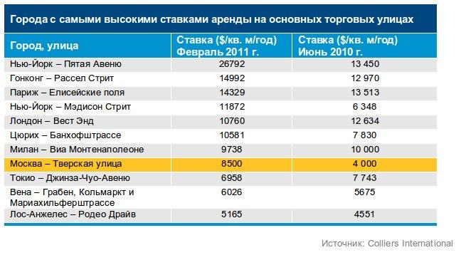 Самым дорогим торговым коридором России на февраль 2011 г. остается московская Тверская улица с арендными ставками от $8 500 за кв.м/год. Об этом сообщает международная консалтинговая компания Colliers International в своем исследовании торговых улиц мира с самыми высокими арендными ставками на торговые помещения. По сравнению с июнем 2010 г. ставки на Тверской возросли более чем в два раза, когда 1 кв.м/год стоил в среднем $4 000.