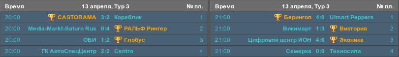 Разгул стихии пришелся именно на этот матч, поэтому команды играли довольно деликатно, но в тоже время не забывали обстреливать ворота друг друга. На 8-й минуте прицельный удар Артема Федорова стал неплохим предзнаменованием для Ralf Ringer. Media—Markt—Saturn продолжал хранить молчание, попутно пытаясь наладить доставку мяча в чужую штрафную. Ralf Ringer тем временем набирал ход и вскоре, благодаря дублю Антона Кулемина, прочно закрепился в ранге лидера. Концовка матча также прошла под диктовку Ralf Ringer, в составе которых лучшим игроком стал Федоров, отдавший ранее две голевые передачи, а на 43-й минуте оформивший дубль, который подвел черту в этом противостоянии.