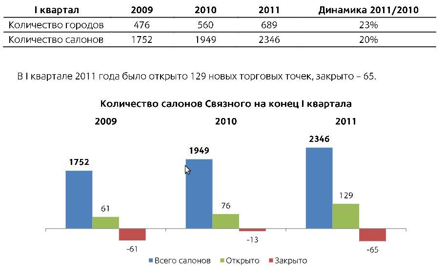 Сотовый ритейлер «Связной» представил результаты продаж в салонах сети за I квартал 2011 г. По данным компании, на конец отчетного периода количество центров мобильной связи компании составило 2346 в 689 городах России. По сравнению с аналогичным периодом в 2010 г. рост сети составил 20%.
