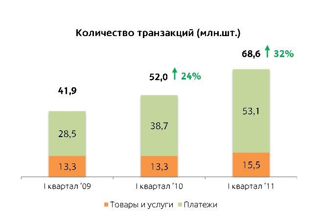 Количество всех совершенных транзакций в салонах «Связного» в I квартале 2011 г. — 68,6 млн шт., что на 32% больше, чем в I квартале 2010 г. Количество транзакций по товарным направлениям выросло на 17%, по платежам рост составил 37%.