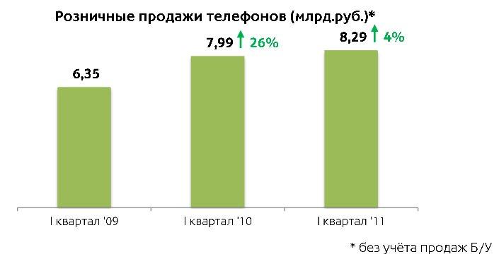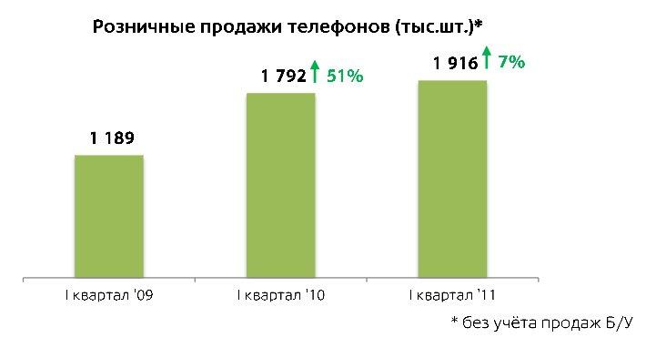 Розничные продажи телефонов в денежном выражении в I квартале 2011 г. выросли на 4% по сравнению с аналогичным периодом в 2010 г. и достигли 8,29 млрд руб.