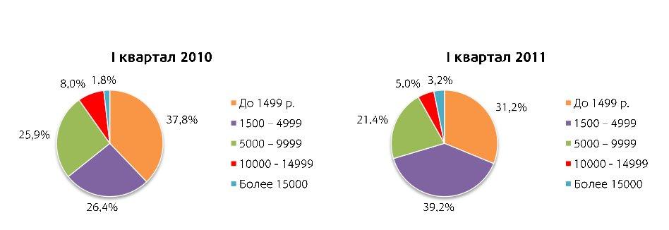 в I квартале 2011 г. по отношению к I кварталу 2010 г. почти в два раза увеличилась доля ценового сегмента «более 15 000 руб.». За тот же период доля сегмента «1 500 — 4 999 руб.» увеличилась на 12,8 п.п., а доля сегмента «до 1 499 руб.» сократилась на 6,6 п.п.