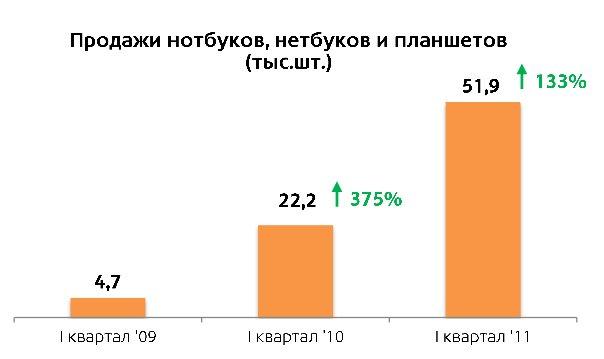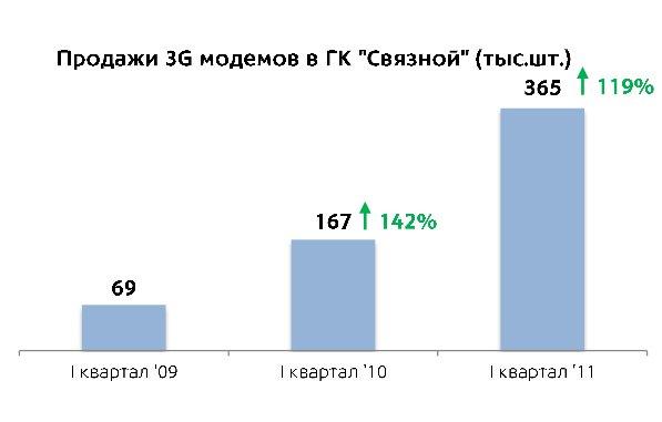 В ГК «Связной» в I квартале 2011 г. существенно возросли продажи ноутбуков, нетбуков и планшетов. Продажи ноутбуков — на 304%, нетбуков — на 74%, планшетов — на 100%. Также показали хороший рост продажи 3G-модемов — на 119%.