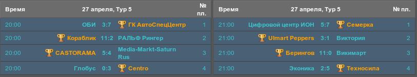 OBI после того как первом туре нанес сокрушительное поражение Media-Markt-Saturn со счетом 8:0, так и не смог одержать ни одной победы. И на это раз команде так и не удалось прервать серию поражений. И винить в этом стоит, прежде всего, лучшего бомбардира команды «АвтоСпецЦентр» Максима Бреслера, забившего в этом матче 5 мячей. Надежда забрезжила для OBI на 29-й минуте, когда при счете 3:0, Артем Солдатов сократил отставание. Но после этого у «АвтоСпецЦентра» отличились Андрей Пахомов и Сергей Пронин, на что OBI отреагировал запоздалым дублем Олега Евстигнеева. 7:3 и OBI по-прежнему продолжает поиск стиля игры, который бы принес команде успех, тогда как «АвтоСпецЦентр» все занимает место в середине турнирной таблицы.