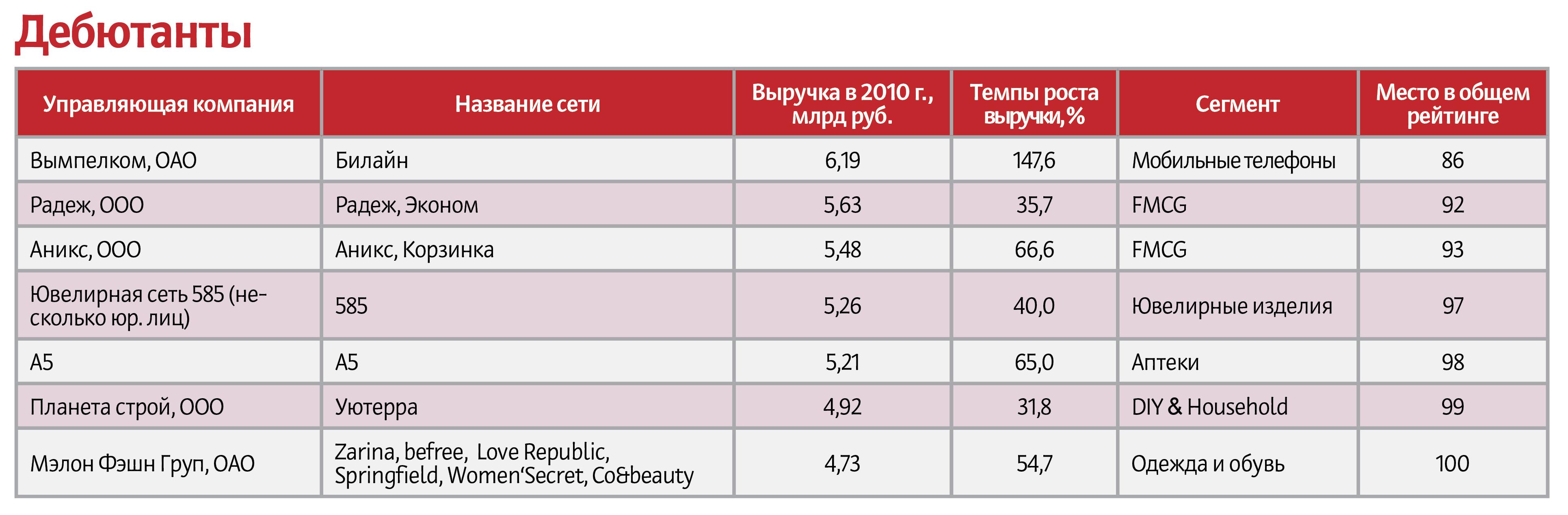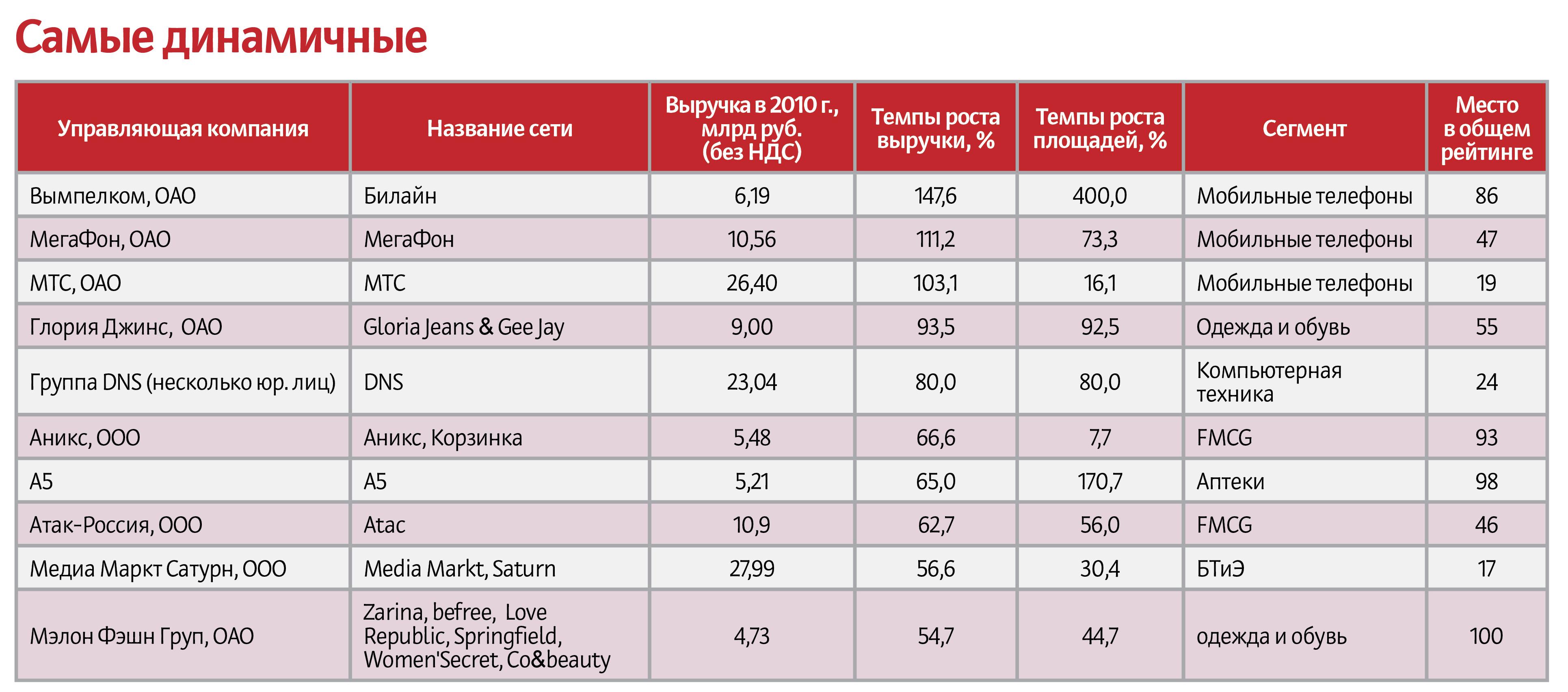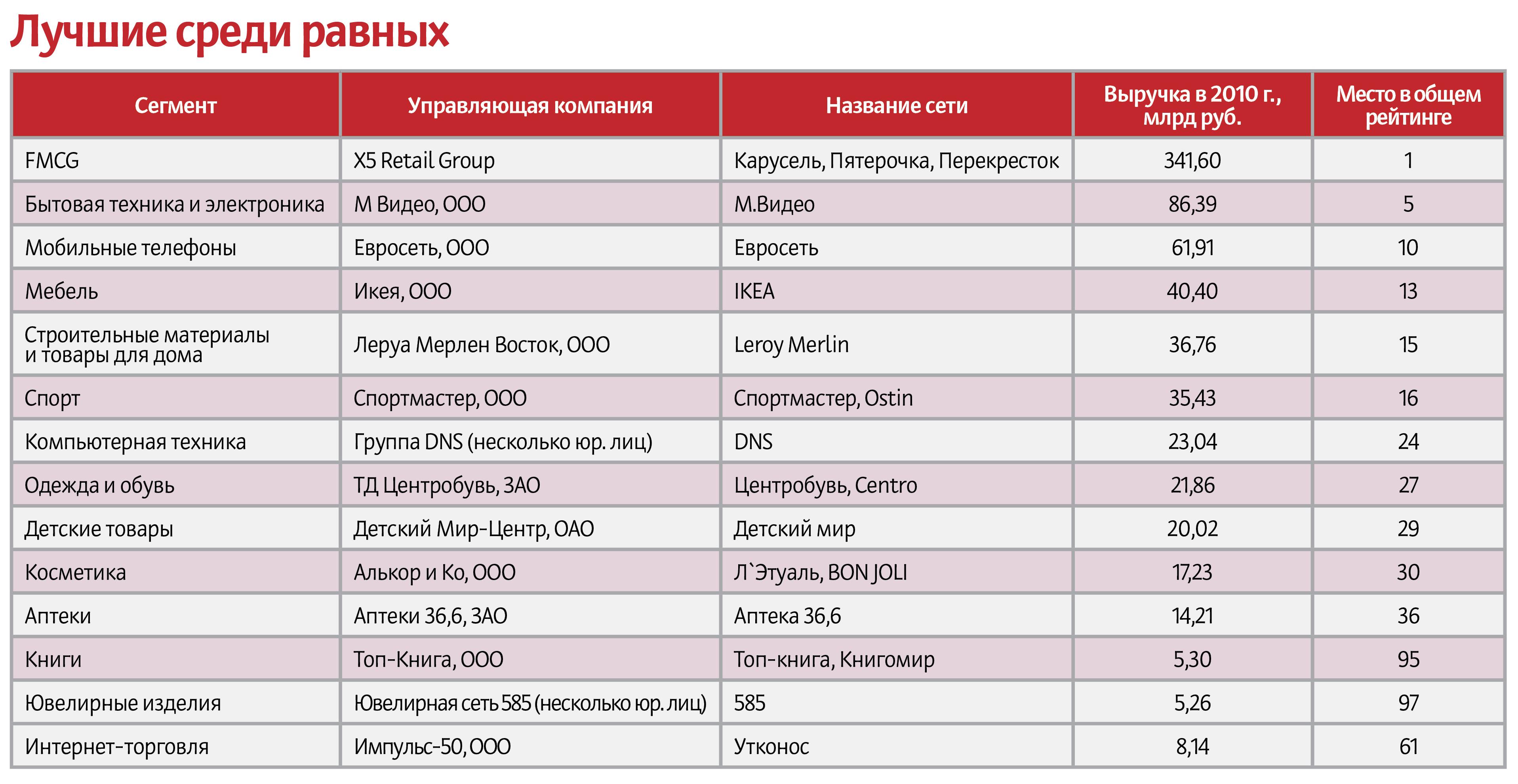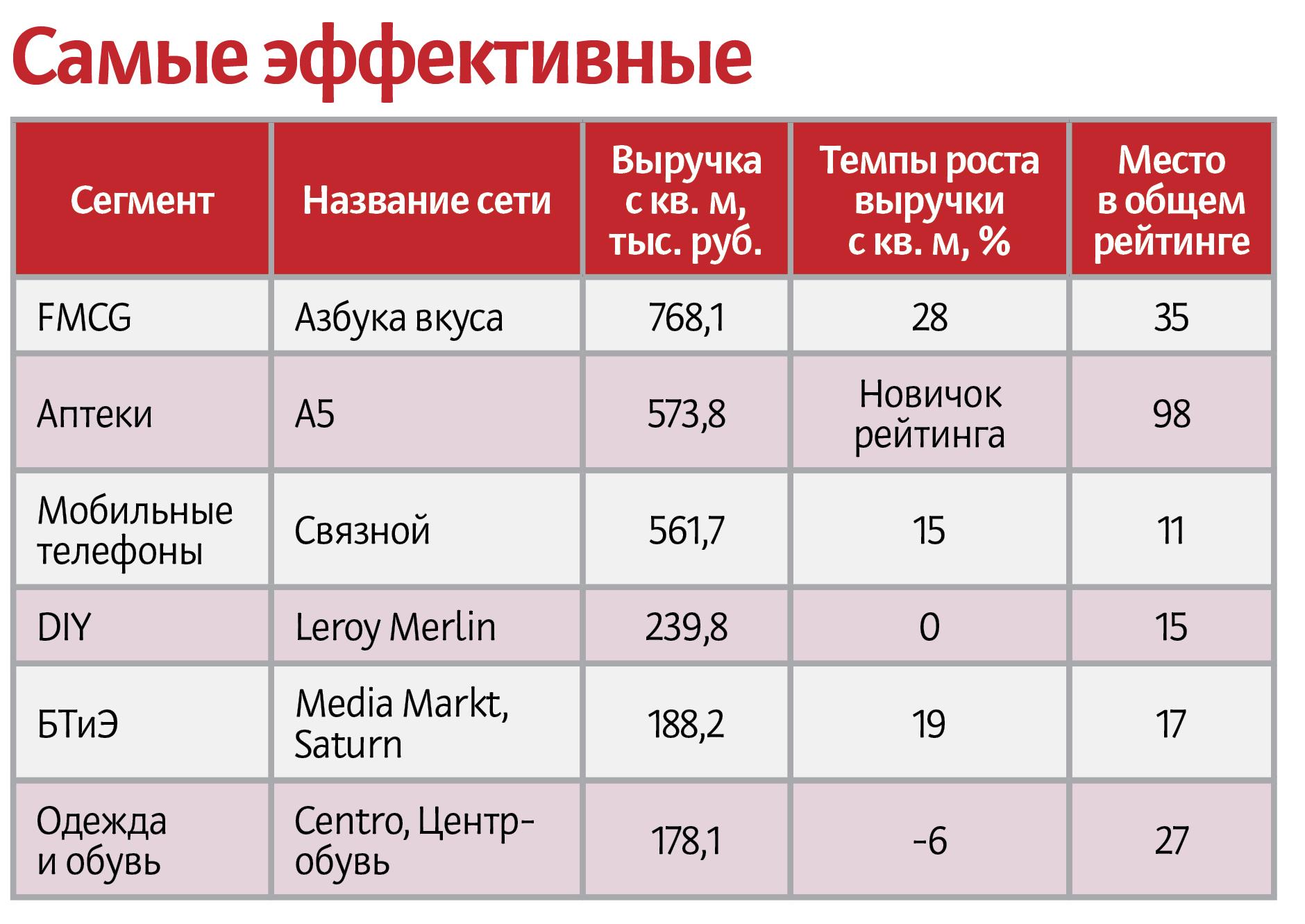 «Евросеть» стала лидером в сегменте мобильные телефоны. По оценке ИА INFOline, прирост составил 13 %. В сегменте DIY — Castorama (прирост LFL — 18 %). Среди аптечных сетей в этой номинации награды удостоилась сеть аптек «А5» — прирост 18 %, а лучшей по показателю в сегменте fashion была признана «Глория Джинс» — 20 %.