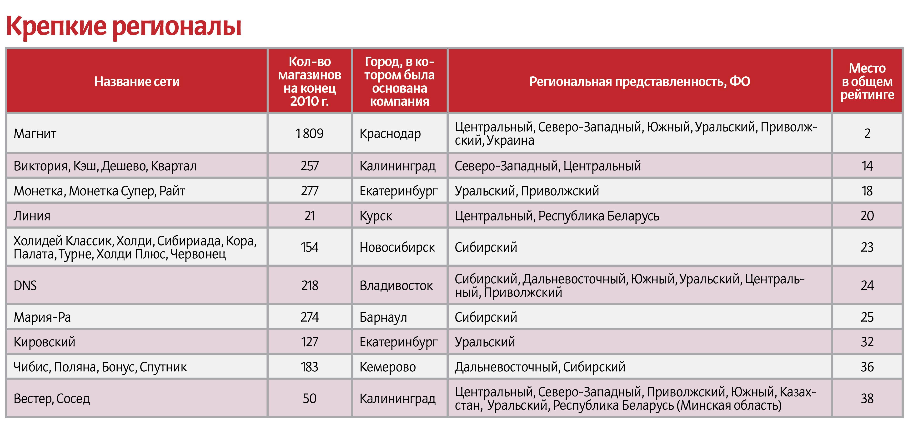 Рейтинг составлялся по нескольким критериям. Учитывались такие показатели как выручка ритейлера по итогам 2009 и 2010 гг. (в рублях), количество магазинов по итогам 2009 и 2010 гг. (в штуках), торговая площадь по итогам 2009 и 2010 гг. (в кв. м.) и показатель LFL (в процентах).