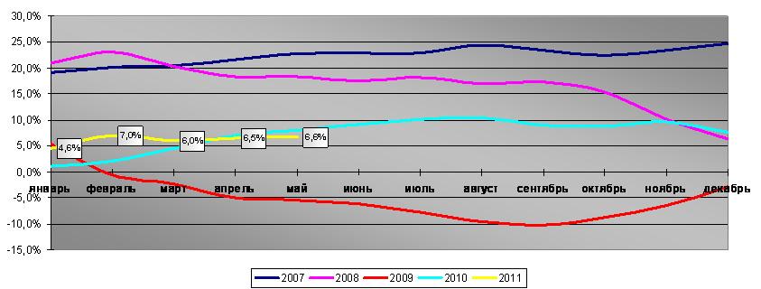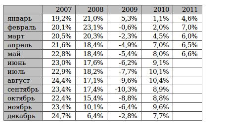 Оборот розничной торговли за первые пять месяцев 2011 г. вырос на 5,2% по сравнению с аналогичным периодом прошлого года и составил около 7 182 трлн. руб. (в январе-мае 2010 г. темпы роста составили 4%), свидетельствуют данные Федеральной службы государственной статистики. Продажи продовольственных товаров выросли за январь-май только на 1% по сравнению с прошлогодним показателем роста в 4,3%, продажи непродовольственных увеличились на 15,6%. По мнению Максима Клягина, аналитика УК «Финам Менеджмент», свою роль в различии показателей по продажам в сегментах играет тот фактор, что высокая инфляция при низких ставках по вкладам мотивируют потребителей к приобретению дорогостоящих товаров.