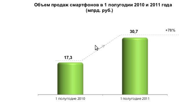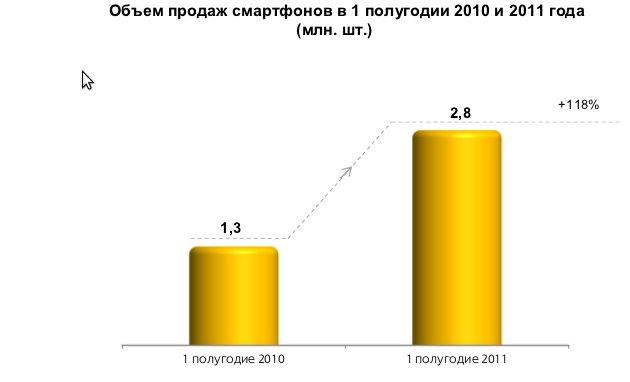 Так, с января по июль 2011 г. продажи смартфонов выросли на 118% по сравнению с аналогичным периодом прошлого года и составили 2,8 млн шт., в то время как продажи обычных сотовых телефонов снизились на 6%.