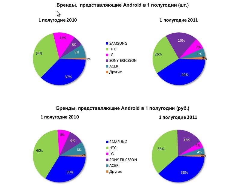 Соотношение игроков на российском рынке, представляющих Android, несколько изменилось. Так по итогам первого полугодия в натуральном выражении доля компании Sony Ericsson выросла на 14%. по отношению к аналогичному показателю прошлого года. Доля Samsung увеличилась на 3% Компания HTC и LG потеряли в продажах Android 8% и 7%, соответственно.