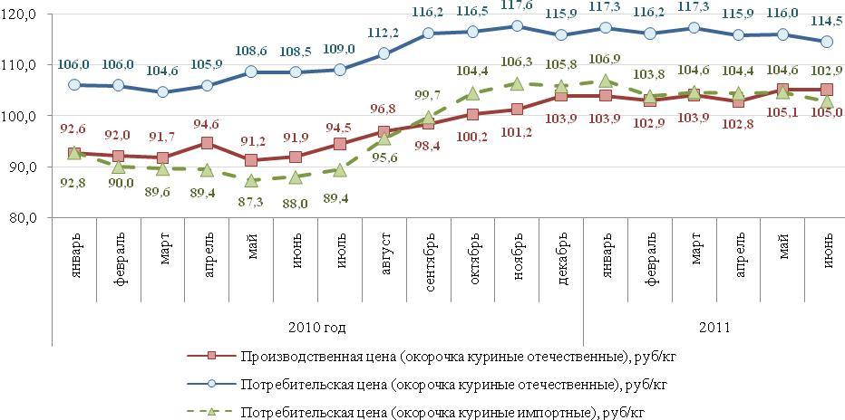 Потребительская цена на данный вид продукта с начала года, напротив, упала на 2%. После возобновления поставок продукции из США в конце 2010 г. цены на импортные окорочка постепенно стали сбивать уровень цен на отечественную продукцию. С начала текущего года потребительская цена на окорочка импортные уже упала на 4%. Однако она на 17% опережает прошлогодний показатель — из-за прекращения поставок цены на импортные окорочка значительно упали в первом полугодии 2010 г.