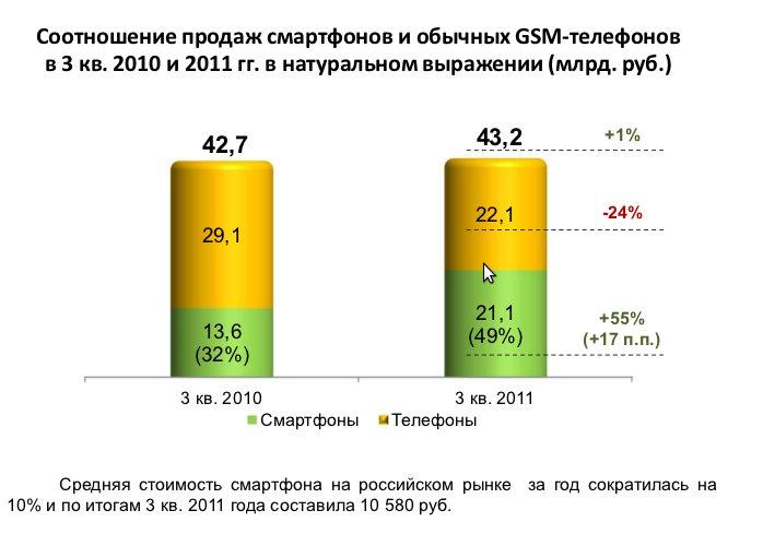 В денежном выражении рынок смартфонов в третий квартал 2011 г. вырос на 55% по отношению к аналогичному периоду прошлого года и достиг 21,1 млрд. руб., что составило 49% от всех мобильных телефонов. Рынок обычных GSM-телефонов в денежном выражении за тот же период сократился на 24%.