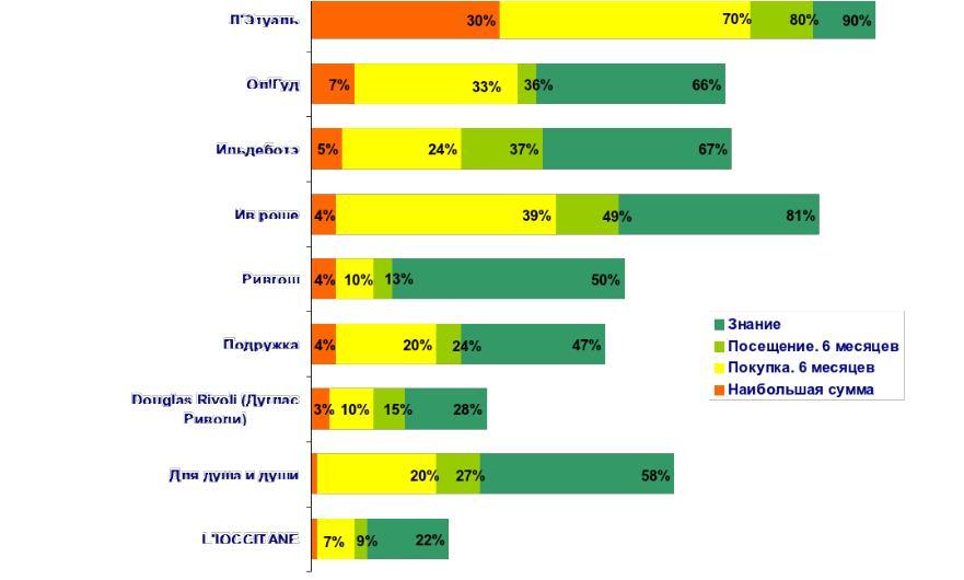 Лидером рынка сетевой розницы в сегменте магазинов парфюмерии и косметики является «Л’Этуаль». 90% респондентов знают этот магазин. Из них 70% делали там покупки за последние полгода, и 30% оставили в магазинах сети максимальную сумму. «Л’Этуаль» — сильная марка с точки зрения привлечении и удержания клиентов. У нее самые высокие показатели, свидетельствующие о том, что сеть удачно переводит знание о марке в покупки.