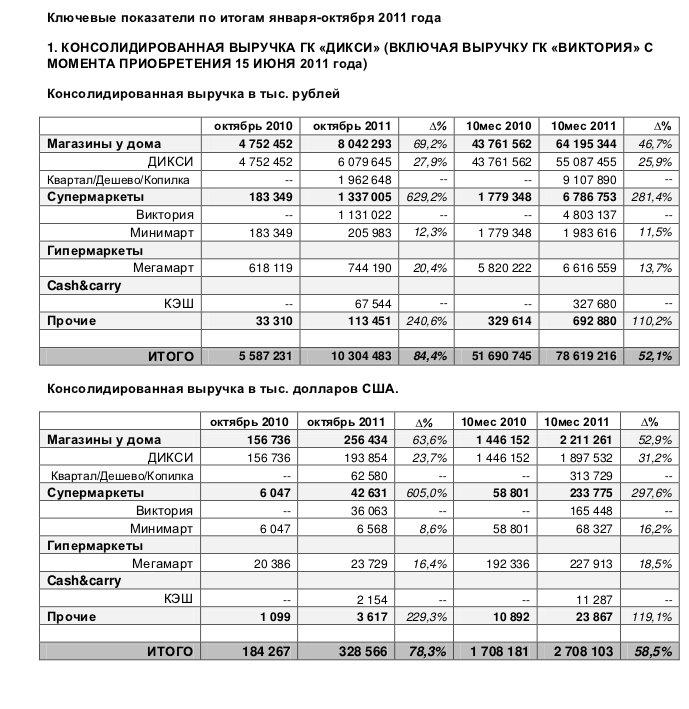 Группа Компаний «Дикси» опубликовала итоги работы за январь-октябрь 2011 г. За отчетный период консолидированная выручка группы (включая выручку ГК «Виктория» с момента приобретения 15 июня 2011 г.) составила 78,6 млрд руб. ($2,7 млрд), увеличившись на 52,1% в рублях и 58,5% в долларах США по сравнению с аналогичным периодом 2010 г.