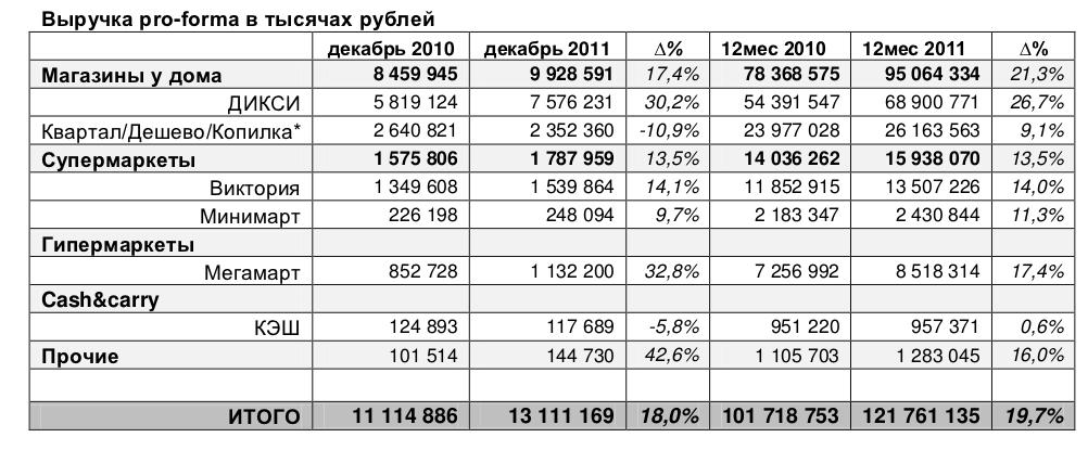 По итогам 12 месяцев 2011 г. розничная выручка формата «магазин у дома» выросла по сравнению с аналогичным показателем 2010 г. на 51,4% в рублях (56,4% в долл. США) и составила 82,3 млрд руб. ($2,8 млрд). Выручка формата «супермаркет» увеличилась на 354,3% в рублях (369,5% в долл. США) и составила 9,9 млрд руб. ($337,5 млн).