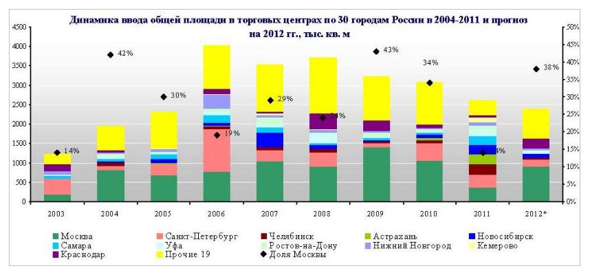 На начало 2012 г. в 32 городах и регионах исследования, проведенного аналитиками INFOLine, общий объем площадей в торговых центрах составляет около 30,5 млн кв. м, из которых 19,5 млн кв. м — арендопригодная площадь. Если все новые комплексы будут введены в эксплуатацию в срок, общий объем площадей в ТЦ по итогам 2012 г. составит около 32 млн кв. м. Насыщенность торговыми площадями по России в целом по состоянию на начало года составляет около 210 кв. м на 1000 жителей.