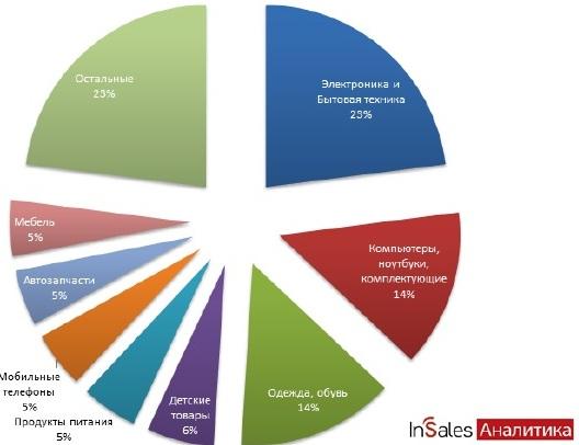 По данным InSales, лидером по годовому обороту 2011 г. стал сегмент «Электроника и бытовая техника». На покупку товаров этой категории россияне потратили 57,3 млрд руб., а это 23,42% от общего объема интернет-продаж. На втором месте — категория «Компьютеры, ноутбуки и комплектующие», на товары из которой жители нашей страны потратили 35,2 млрд (14,39%). Почти столько же было потрачено на одежду и обувь – 34,4 млрд (14,06%).