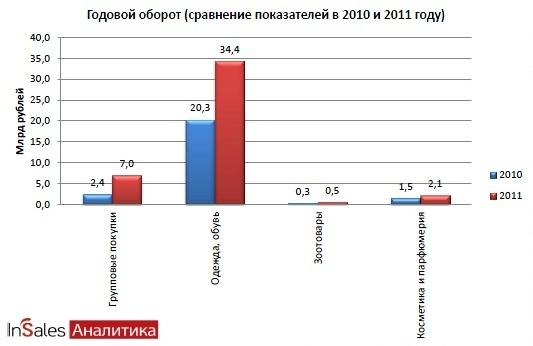 Самый большой рост (69%) в 2011 г. показали одежда и обувь, посчитали в InSales. По мнению аналитиков, данный сегмент начал активно развиваться с появлением на рынке таких проектов как КupiVip.ru и Sapato, в которые были инвестированы $55 млн и $12 млн соответственно. По мнению исследователей РБК, росту интернет-продаж одежды и обуви в России также способствовало то, что онлайн-рителеры улучшили презентацию товаров на сайте и качество фотографий, что позволило упростить процесс осуществления заказов для пользователей. Кроме того, многие интернет-магазины начали привозить сделавшему заказ клиенту одежду и обувь разных размеров, предоставлять возможность бесплатного обмена заказанного товара или возврата денег.