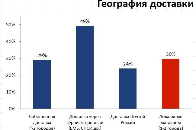 С точки зрения использования разных каналов доставки 49% интернет-ритейлеров пользуются почтовыми сервисами (EMS, СПСР, др.), 29% развивают собственную доставку, 24% предпочитают услуги «Почты России». Примерно 30% онлайн-магазинов вообще не доставляет товары в другие города.