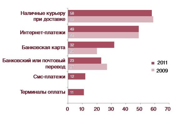 Большинство российских интернет-покупателей по-прежнему предпочитают платить наличными курьерам, так как людям важно проверить товар перед приобретением. Так, по данным Ozon.ru, 80% всех платежей за товары – это наличные при получении. На оплату картами приходится около 10%, оставшиеся 10% распределяются среди других способов, включая оплату электронными деньгами.