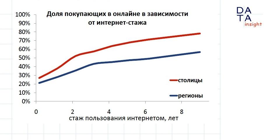 На покупки с доставкой в другой регион сегодня приходится всего лишь одна четвертая оборота интернет-торговли (70 млрд руб.). Согласно исследованию Data Insight, 45% всех покупок в денежном выражении приходится на Москву и Санкт-Петербург, 24% приходится на онлайн-доставку (например, при скачивании мультимедийного контента или покупке электронных билетов), 9% продают в регионах местные интернет-магазины.