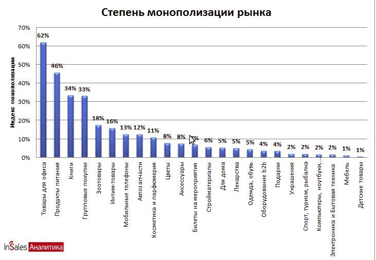 Самым консолидированным сегментом рынка интернет-торговли являются автозапчасти, в котором сейчас работает единственный крупный игрок — exist.ru, и товары для офиса, где лидирует komus.ru. На третьем месте идут книги: по оценке Data Insight, лидер сегмента Ozon.ru генерирует около 50% оборота данной категории.