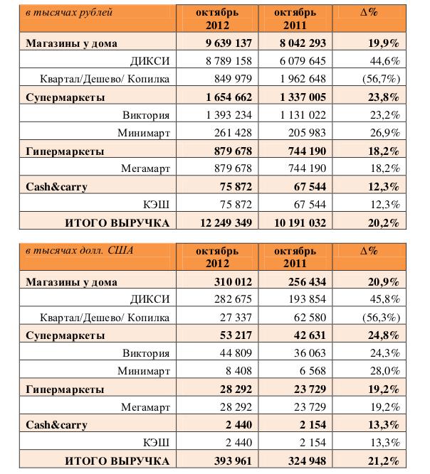 По данным финансового отчета компании, общая консолидированная розничная выручка за октябрь 2012 г. выросла на 20,2% в рублях