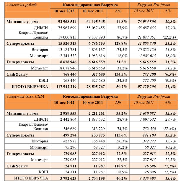 Общая консолидированная выручка ГК «Дикси» (включая выручку ГК «Виктория» с момента приобретения 15 июня 2011 г.) за десять месяцев 2012 г. выросла на 50,2% в рублях (40,2% в долларах США) по сравнению с аналогичным периодом прошлого года и составила 117,9 млрд руб. ($3,8 млрд).