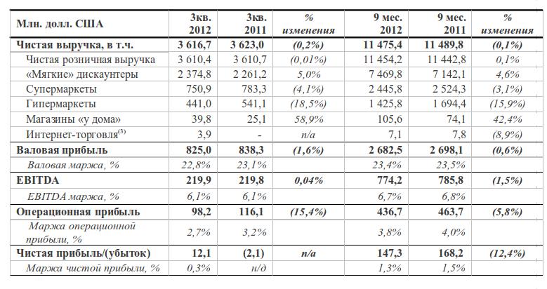 По данным финансовой отчетности компании, в рублевом выражении чистая выручка за третий квартал и девять месяцев 2012 г. увеличилась на 10,2% и 8% соответственно до 116,08 млрд руб. и 356,86 млрд руб. соответственно. Как уточняется в отчете, в основном за счет увеличения розничных продаж «мягких» дискаунтеров и супермаркетов, что было частично компенсировано снижением розничных продаж в гипермаркетах.