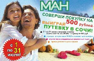 12. В волгоградской сети продуктовых магазинов «Ман» с 1 по 31 июля проводится розыгрыш путевки в Сочи. При совершении покупки на 500 руб. нужно на чеке написать свое имя и контактный телефон, затем опустить чек в ящик. 8 августа по радио состоится розыгрыш приза.