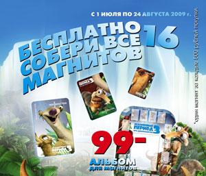 10. Сеть супермаркетов «Перекресток» с 20 июля по 24 августа 2009 г. проводит акцию «Ледниковый период — 3!». За каждые 500 руб. покупки покупатель получает магнит с героями мультфильма. Собравшие всю коллекцию магнитов, получают возможность участвовать в розыгрыше призов. Для этого надо сфотографироваться около доски со всеми магнитами и прислать письмо с контактными данными. Первые 600 участников получают призы.