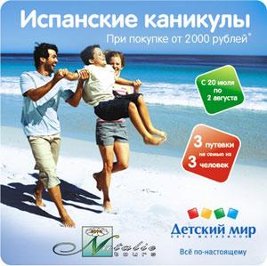 7. Сеть магазинов «Детский мир» с 20 июля по 2 августа 2009г. проводит акцию «Испанские каникулы». Каждый покупатель, купивший товары на сумму от 2000 руб. получает возможность участвовать в розыгрыше путевки на 3 человек на испанское побережье Средиземного моря. Акция проходит только в магазинах Москвы и Московской области.
