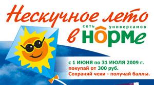 2. С 1 июня по 31 июля 2009 г. сеть продуктовых супермаркетов «Норма» проводит акцию «Нескучное лето!». За каждый чек на сумму более 300 руб. покупатель получает баллы. Накопив 20 баллов, можно получить в подарок билет на одну персону в сеть кинотеатров «Кронверк-Синема», а за 50 баллов — сумку-холодильник для пикника.
