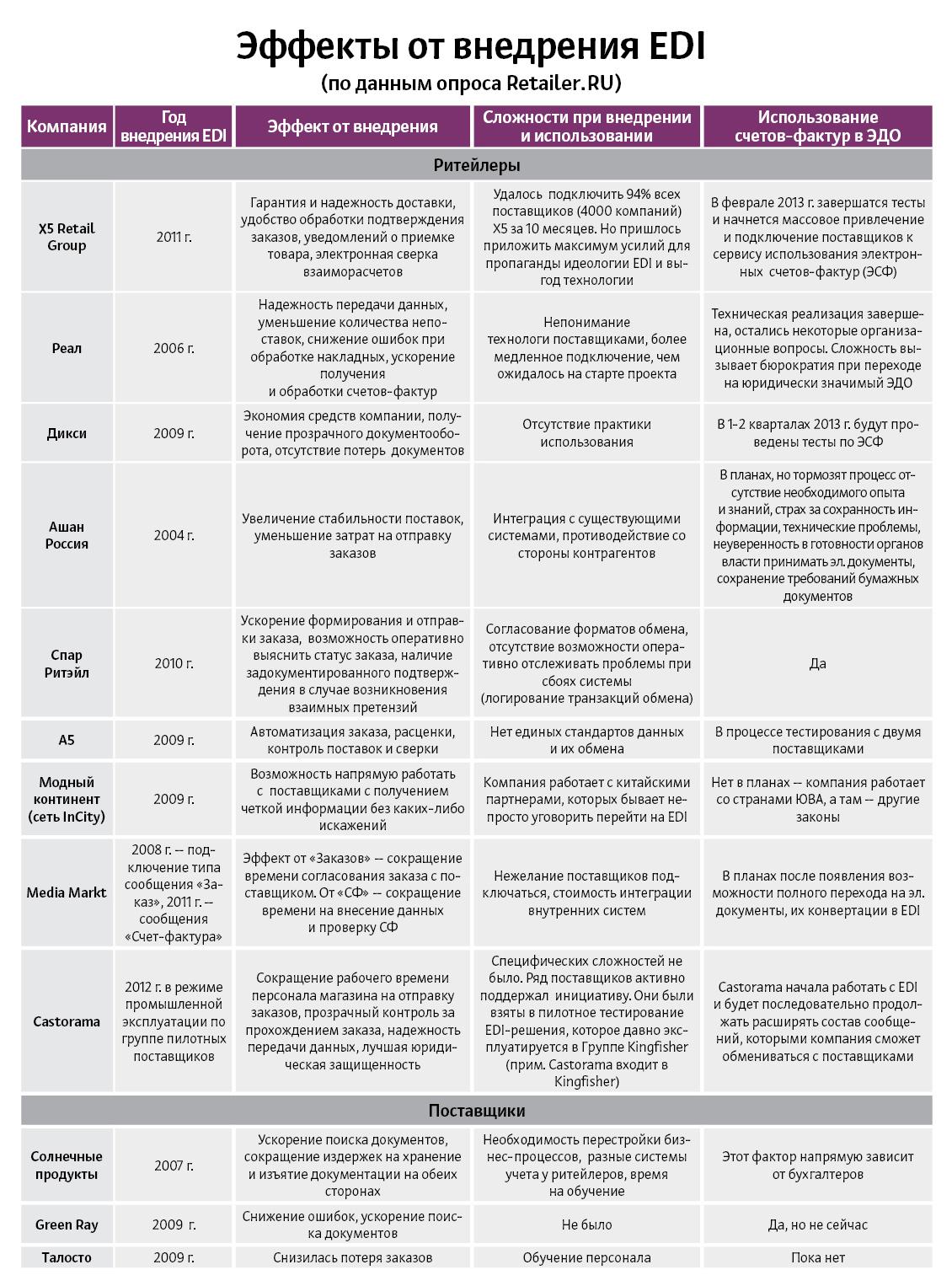 То, что EDI обязан иметь не только ритейлер, но и все его поставщики, говорит и Ринат Мухаметвалеев, генеральный директор компании «Трест СКМ» (DIY-сети «Суперстрой» и «Стройарсенал»), начавшей использовать EDI в 2012 г. «Пока эффекта от внедрения технологии мы не ощутили, но это и понятно — EDI, как любой другой стандарт, предъявляет требования к бизнес-процессам и информационной системе внутри компании», — комментирует топ-менеджер. Много сил и ресурсов «Трест СКМ» потратил на подготовку перехода к EDI еще до самого подключения, однако останавливаться не планирует. В ближайшее время компания перейдет также и на ЭДО.