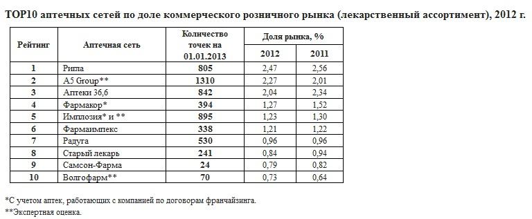 Аптечная сеть «Ригла» второй год подряд сохраняет лидерство по доле рынка. По результатам 2012 г. ритейлер занял первое место в рейтинге аптечных сетей IMS Health, исследовательской компании в области фармацевтической промышленности и здравоохранения,- доля рынка сети составила 2,47%., говорится в официальном сообщении компании.