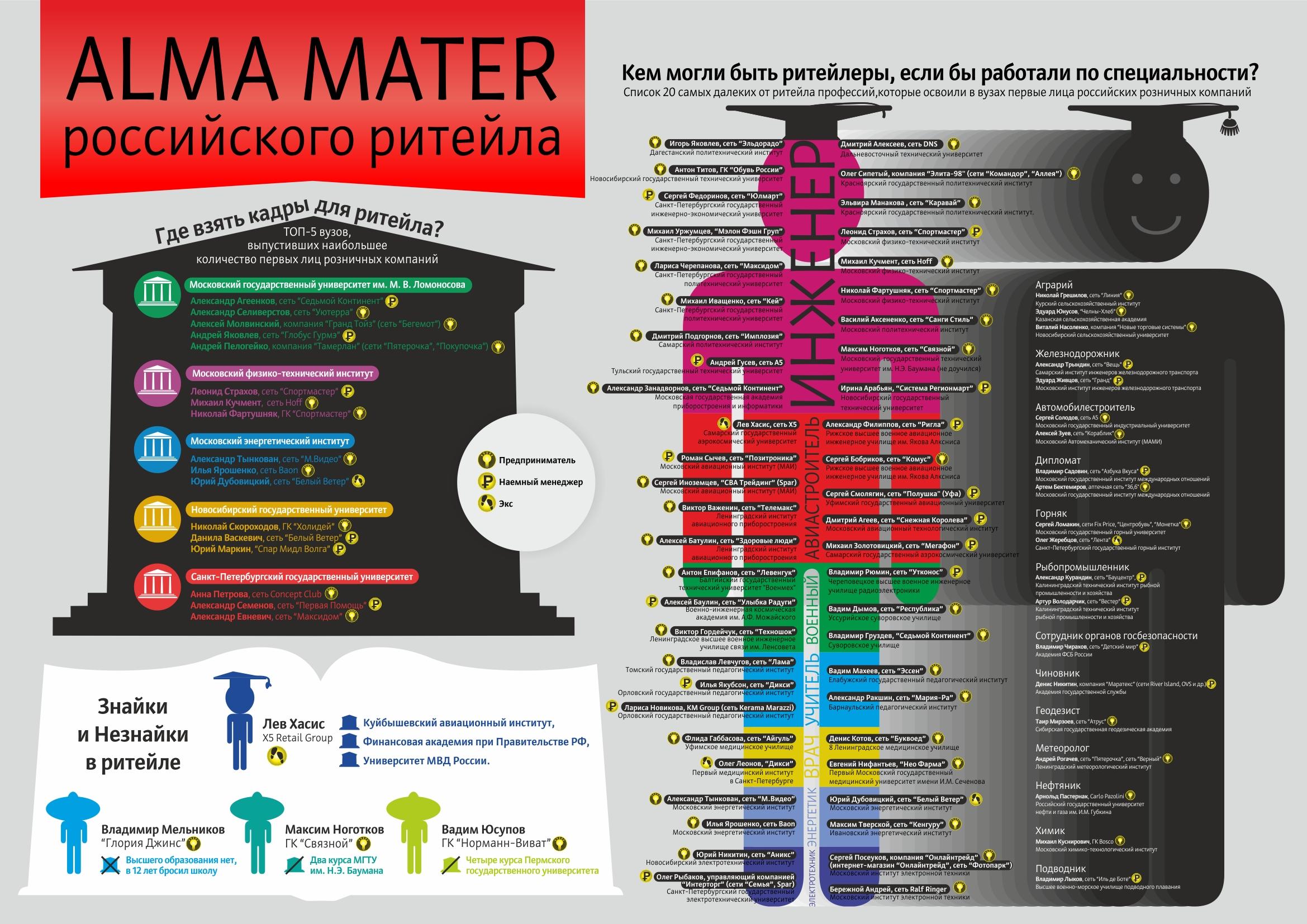 В топ-5 вузов по количеству выпускников-ритейлеров также вошли Московский физико-технический институт, Московский энергетический институт, Новосибирский государственный университет, Санкт-Петербургский государственный университет (см. инфографику).