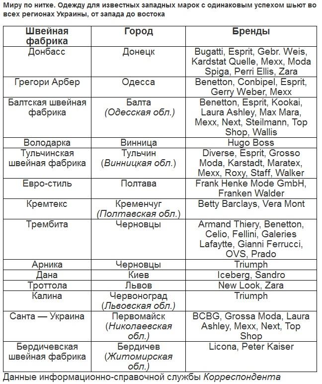 Модельер Анна Бублик рассказывает Корреспонденту, что не раз встречала в Европе пальто и костюмы Hugo Boss украинского производства, а ее подруги привозили из Германии, Англии, Польши и Италии вещи других марок, сшитые в Украине. В свою очередь, владелица киевского магазина одежды Пюре Татьяна Кремень вспоминает бирки с надписью Made in Ukraine, увиденные ею в лондонском Top Shop.