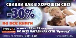 Сеть книжных магазинов "Буквоед" доказала, что формат ночных распродаж может привлечь не только охотников модой, но и за знаниями. В ночь с 22 на 23 февраля в тридцати магазинах ритейлера прошла акция "Ночь распродаж". В это время на все книги действовала скидка 30%.