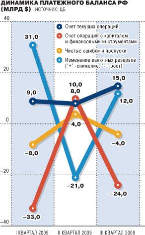 Из данных ЦБ следует, что положительное сальдо счета текущих операций, на фоне роста профицита торговли товарами устойчиво увеличивается и в третьем квартале 2009 года составило $15 млрд (см. график). Динамика счета операций с капиталом платежного баланса выглядит менее устойчивой. За январь—сентябрь 2009 года отрицательное сальдо по капитальному счету (отток капитала) составило $46,1 млрд. В третьем квартале 2009 года чистый отток иностранного капитала составил $24 млрд, что практически совпадает с оценками, которые "Ъ" публиковал в начале сентября (см. "Ъ" от 9 сентября). Основную часть оттока в июле—августе составлял перевод российскими банками валюты с корсчетов в ЦБ на счета иностранных банков, после того как с 1 июля были отменены рекомендательные ограничения на наращивание иностранных активов банков — они введены в ноябре 2009 года с целью уменьшить давление на рубль и увеличить международные резервы (валютные корсчета банков с того времени формально оставались частью резервов ЦБ).