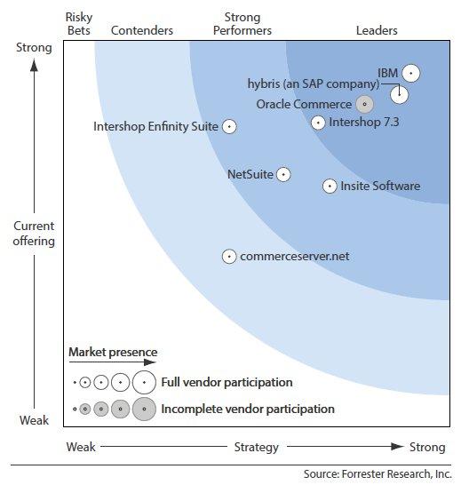 По данным Forrester Research, для сегмента В2В компания IBM предлагает три основных продукта: Webshere Commerce, Sterling CPQ и Sterling Order Management. Все вместе они позволяют выстроить довольно интересное комплексное решение. Однако эти продукты продаются по отдельности и на практике очень мало примеров, когда компания покупает все три решения и интегрирует их.