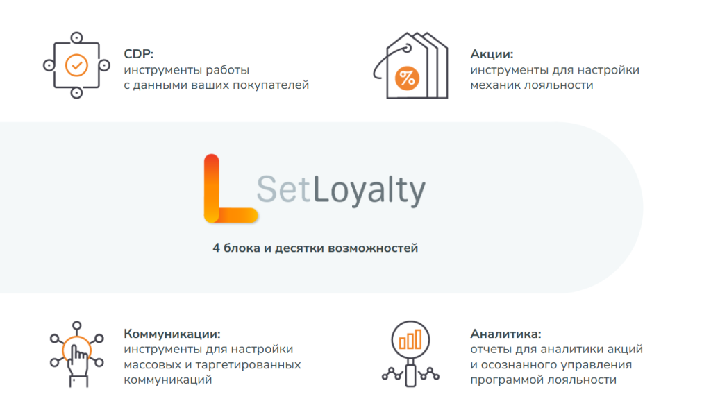 C 2025 года Set Loyalty интегрируется с любыми кассовыми системами через универсальное API. Состоит из 4 модулей, которые закрывают основные задачи маркетолога на всех этапах работы с программой лояльности, независимо от масштаба сети.