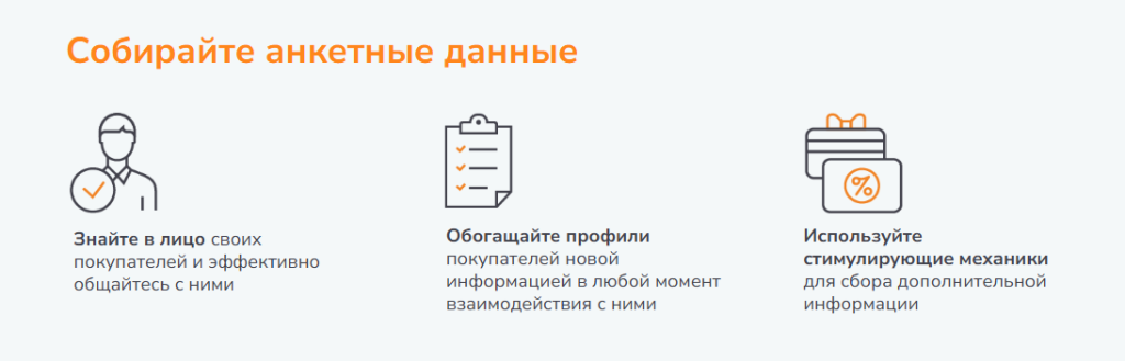 Система верифицирует данные с помощью подтверждения номера телефона или адреса электронной почты. Но процесс сбора данных не заканчивается на этапе регистрации — профили покупателей обогащаются новой информацией на всём пути клиента.