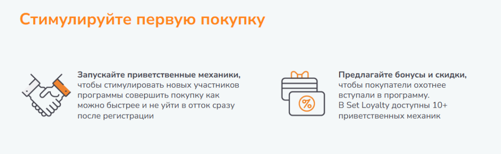 Set Loyalty позволяет настраивать приветственные механики, стимулирующие совершить первую покупку. Например, дать скидку или начислить бонусы, действующие ограниченное время. Сделать это можно сразу всем новым участникам или только тем, кто не совершил покупку в заданный период времени. Также можно запустить автоматизированную приветственную рассылку.