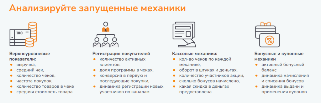 — Кассовые механики: количество чеков по каждой акции, участников акции, сумма предоставленных скидок.