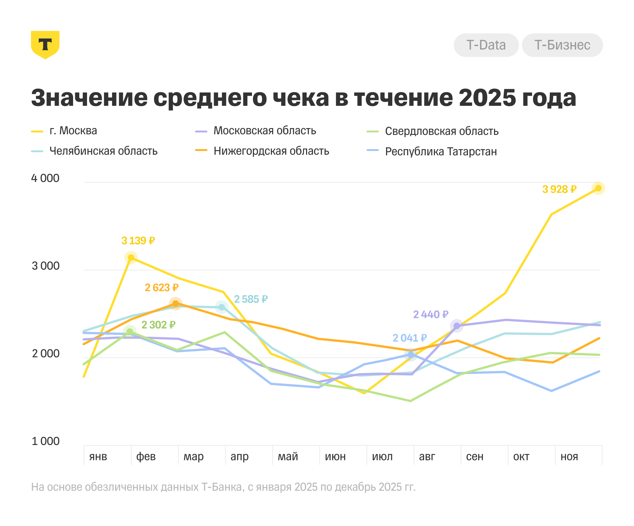 Москва продемонстрировала наиболее интенсивные темпы роста среднего чека с февраля по март и с ноября по декабрь. В феврале и марте средний чек был 3 139 ₽ и 2 916 ₽, а в ноябре и декабре — 3 638 ₽ и 3 928 ₽.