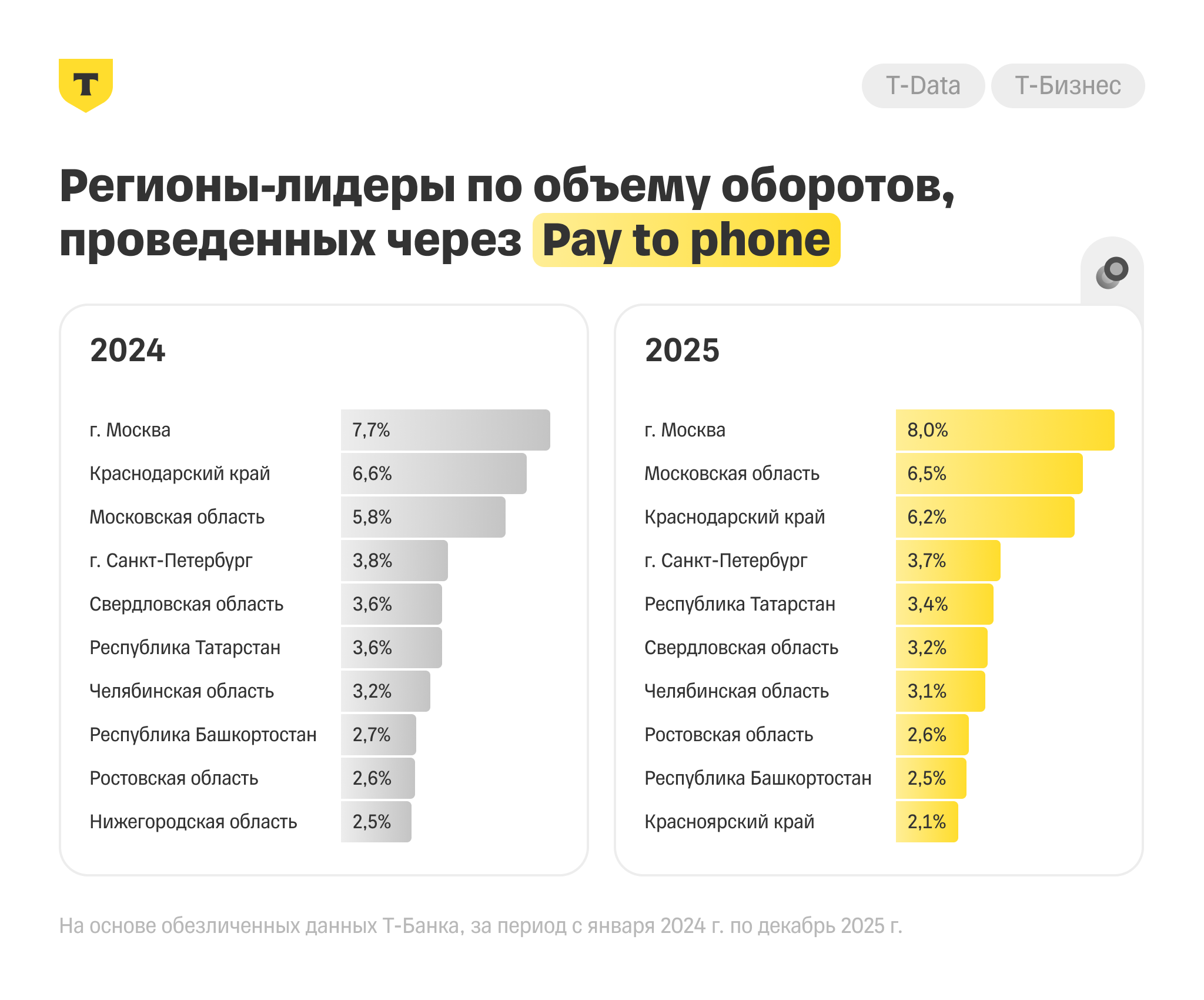 - Регионы-лидеры по объему проведенных платежей за 2025 год: Москва и Московская область — 8% и 6,5% платежей (здесь и далее — доля от всех платежей в рублях через Pay to phone).