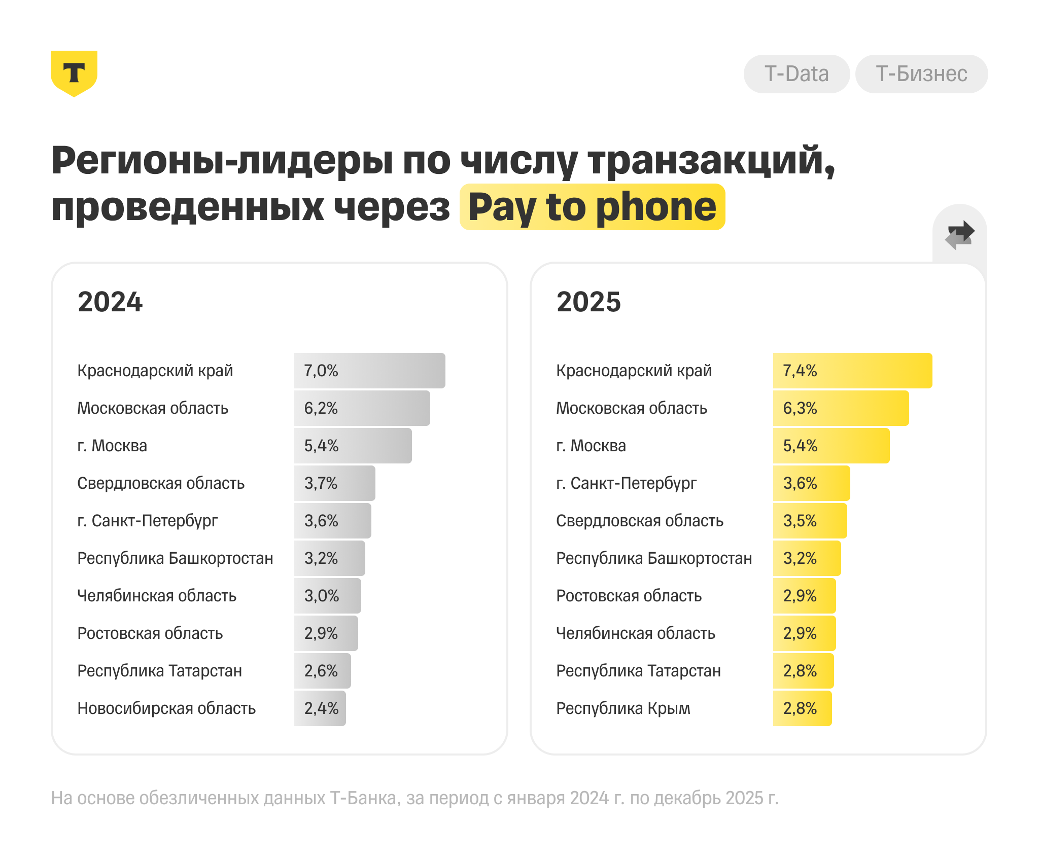За 2025 год лидерами среди регионов по объему проведенных платежей через Pay to phone стали: Москва (8%), Краснодарский край (6,2%), Московская область (6,5%), Санкт-Петербург (3,6%) и Свердловская область (3,1%). Здесь и далее приведены доли от всех платежей Pay to phone в рублях. Те же регионы лидировали по проценту оплат QR-кодами через СБП по Pay to phone: Москва (7,1%), Московская область (6,1%), Краснодарский край (6,7%), Санкт-Петербург (4%).