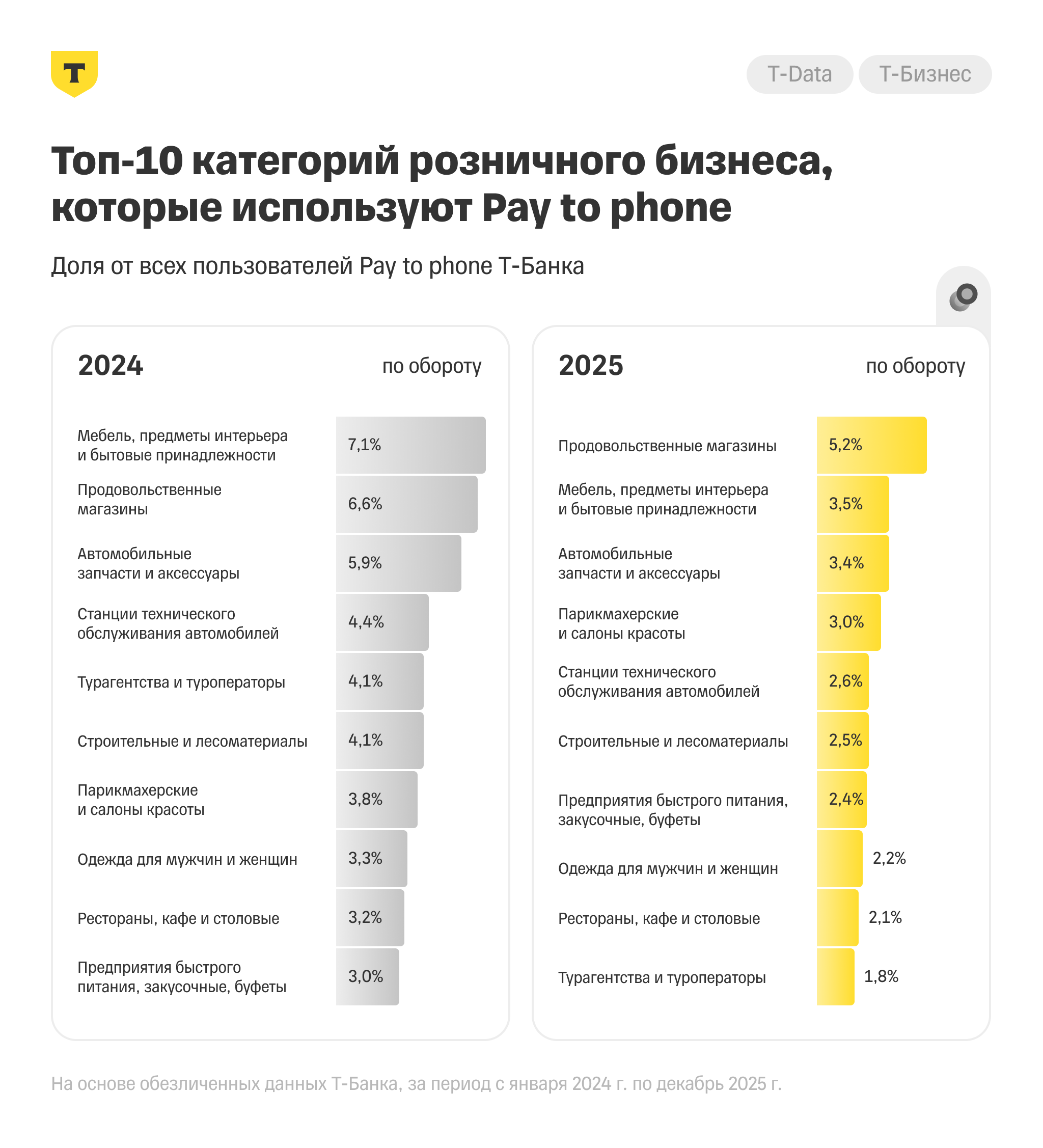Наибольшую долю оборота платежей по Pay to phone в 2025 году сделали компании из категорий продовольственные магазины (5,2%), мебель и предметы интерьера (3,4%) и автомобильные запчасти (3,4%). Значения по остальным категориям перечислены ниже: