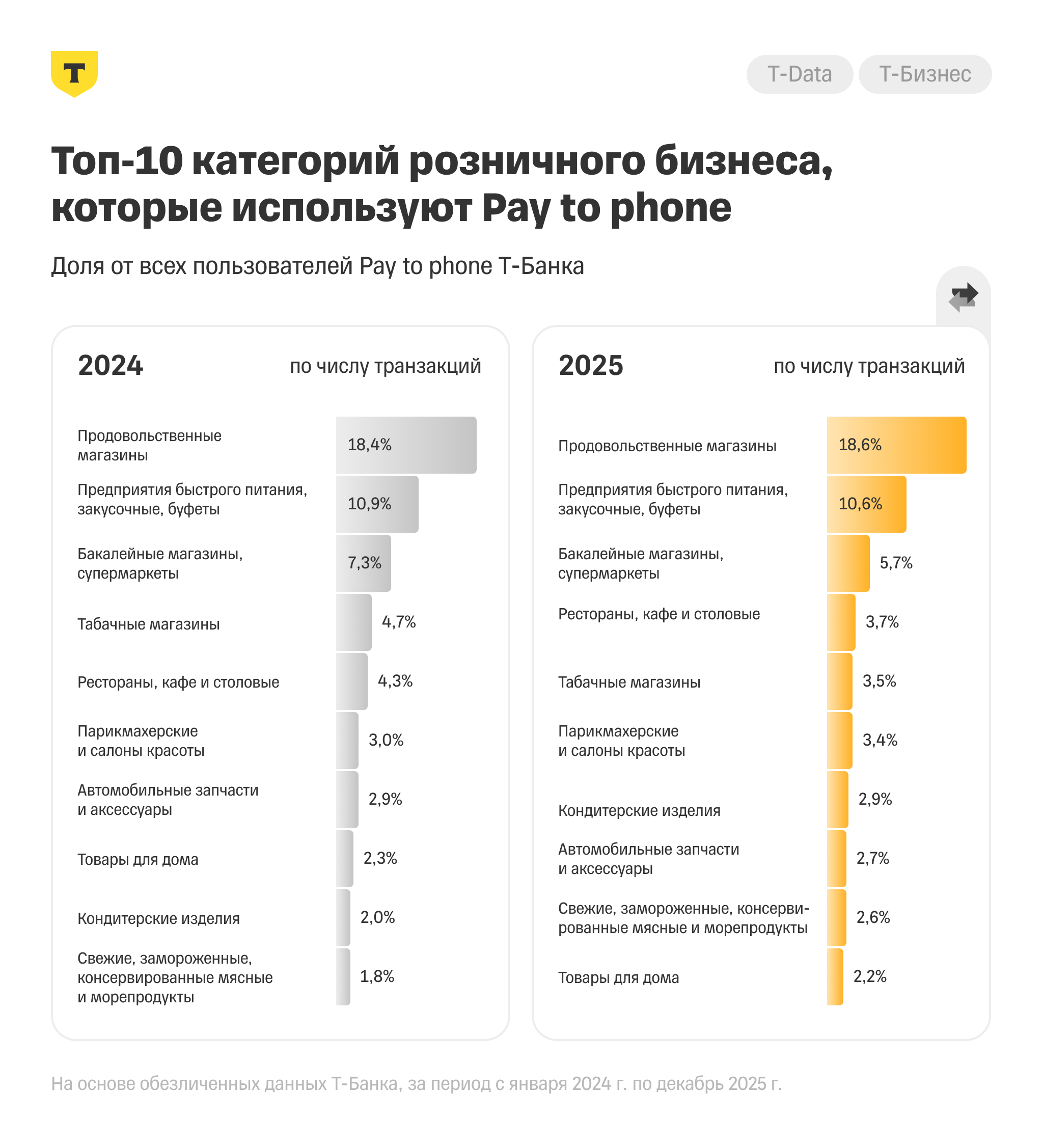 - В 2024 и 2025 годах в топе по количеству проведенных платежей остались продовольственные и бакалейные магазины, а также предприятия быстрого питания.