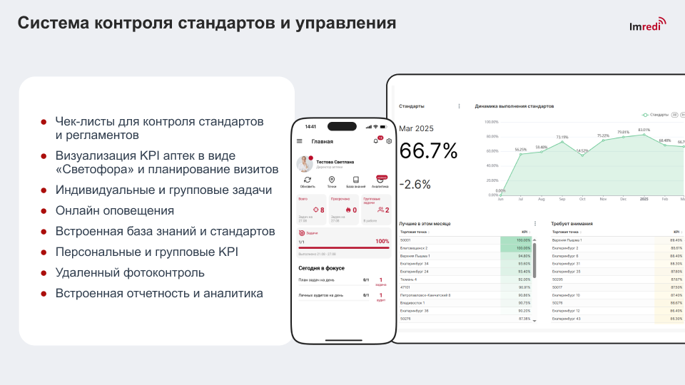 Подготовим расчет окупаемости и поможем подобрать индивидуальное решение для вашей аптечной сети, а также покажем все преимущества работы с мобильным рабочим местом Imredi на бесплатной демонстрации.