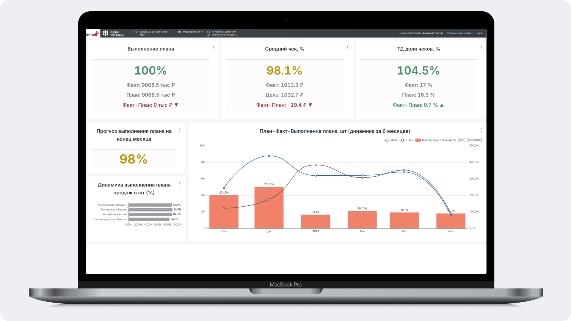 Можно настраивать свои KPI под специфику бизнеса, задавать целевые значения и отслеживать отклонения, видеть выполнение планов в реальном времени и прогноз выполнения на конец периода, а не «по факту месяца».